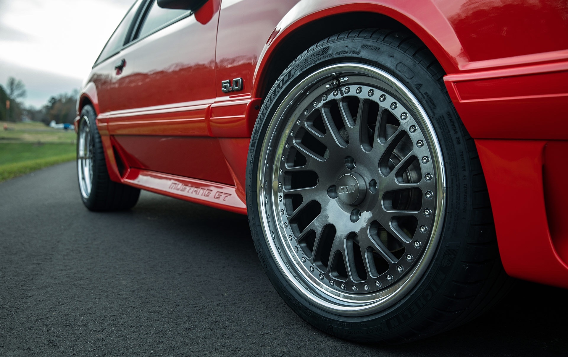 CCW Twisted Classic Forged Wheels – Gunmetal with Polished Lips for the Red Foxbody Mustang.