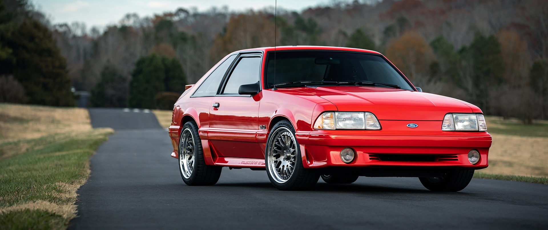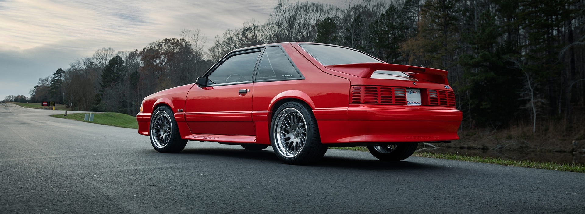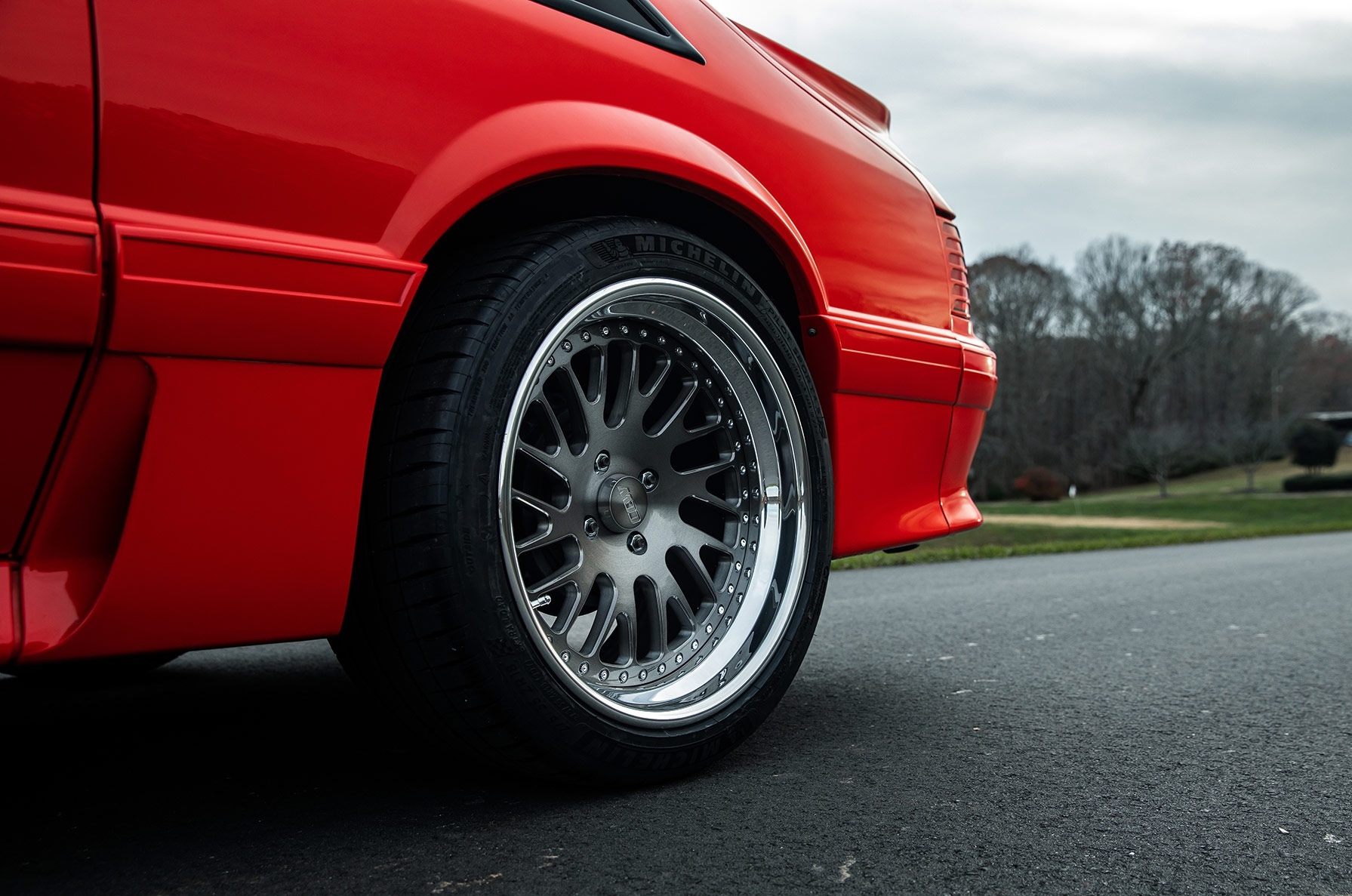 The Twisted Classic design features a directional five-spoke pattern, giving a sense of movement even at rest. Its Gunmetal center adds depth and contrast to bright body colors like red, while the Polished Lips reflect the light and define the wheel’s three-piece structure. Together, they elevate the Foxbody’s aesthetic without losing its raw muscle-car roots.